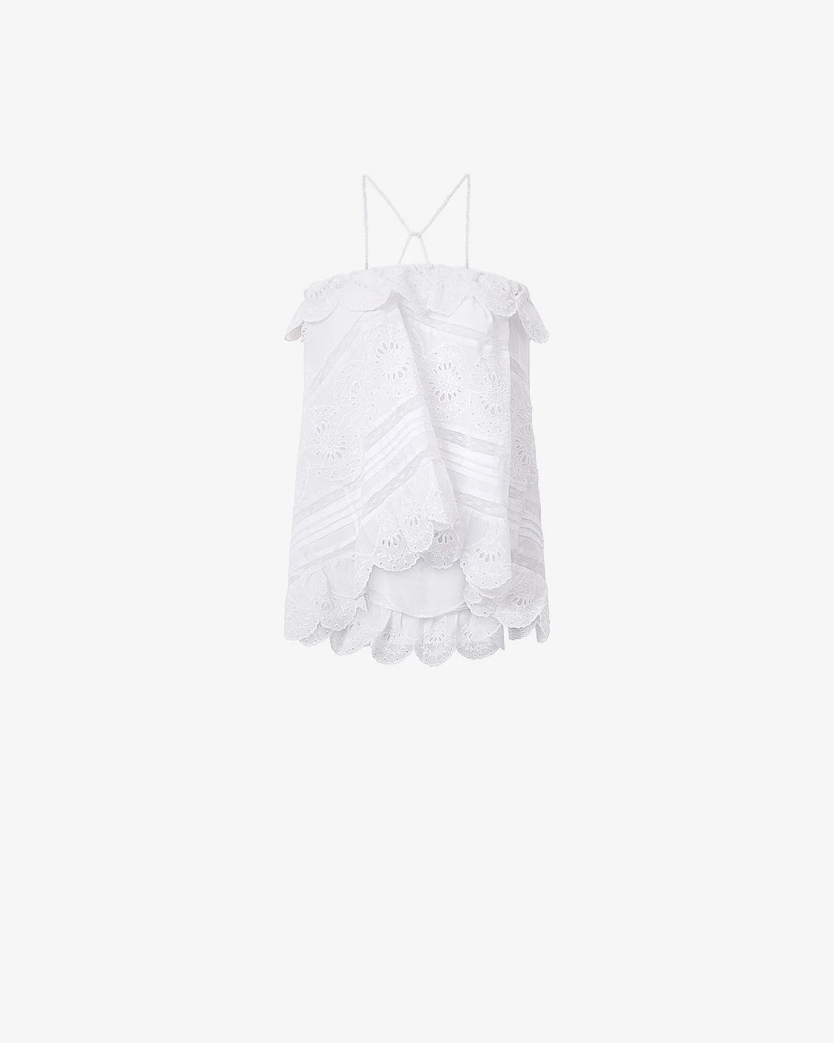 Organic cotton and floral lace top Thin halterneck straps with a crossover neckline Frills and pintucks Flared cut Style: HT0769FAD1J05E20WH PRISHA 100% cotton (1) Care & Sustainability Machine wash on a gentle cycle, inside out and at a maximum temperature of 30°C For more details, see the instructions on the composition label the history and environmental impact of this product