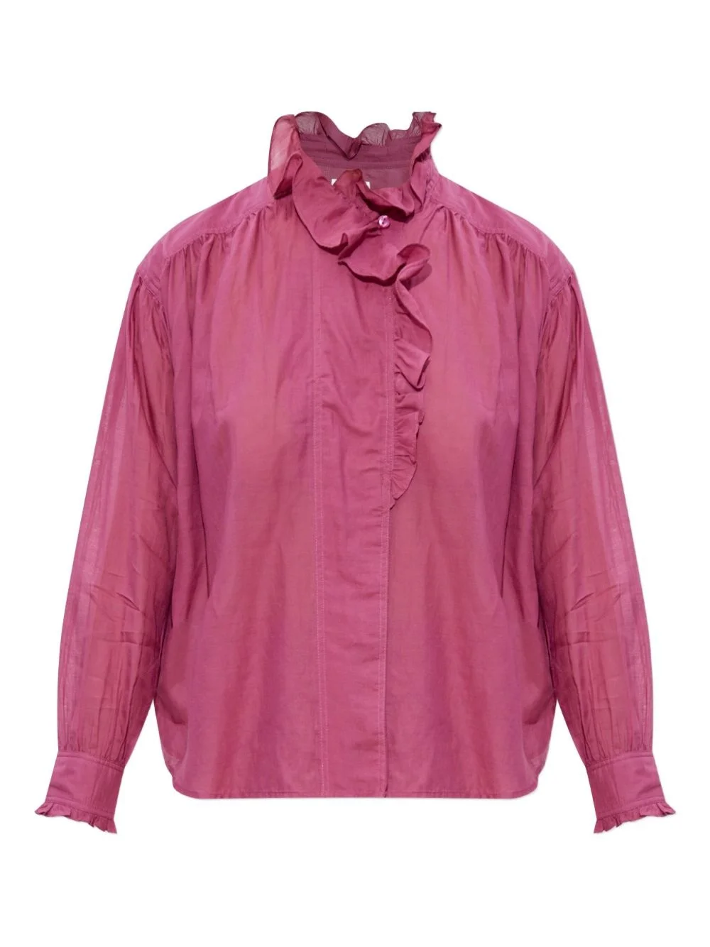 ruffled high-neck blouse Highlights - Pink - High neck - Ruffled neckline - Long sleeves - Ruffled cuffs - Button fastening Imported Composition Cotton 100% Washing instructions Read Manufacturer Guidelines