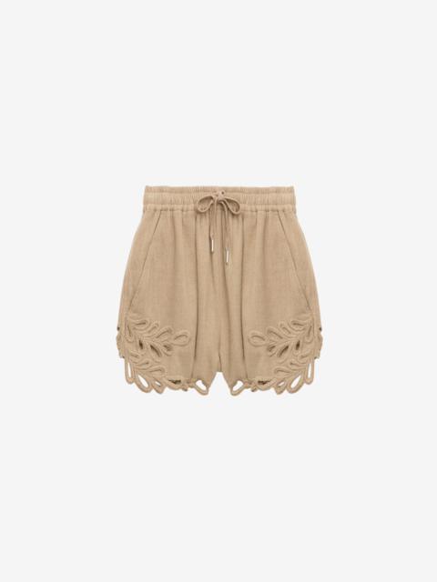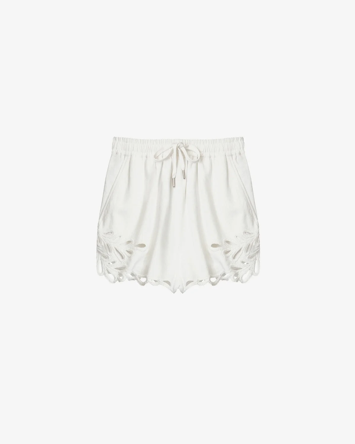Short cotton shorts with openwork embroidery Elastic waist with drawstring Side pockets Openwork embroidery on the hems Relaxed fit Style: SH0187FAC1J12E20WH SAFA 100% cotton