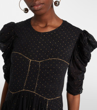 Hailing from Paris, Marant Etoile captures the art of French nonchalance through breezy yet polished staples. The Sichene maxi dress is made from a smooth cotton fabric with delicate polka dots and voluminous sleeves. Product Details - Material: 100% cotton (organic) - Care instructions: machine wash at 30 degrees - Made in India - Color: black - Designer color name: Black - Lining: 100% cotton - Embroidery: 100% polyester - Trim: 100% polyester - Self-tie back - Closure: concealed zipped back - Item number: P01132138 Size & Fit - Fits large to size - we recommend trying one size smaller - Low back - Cinched waist - Non-stretchy fabric - The model seen in the picture is 178cm-5'10" and wearing a size FR 34