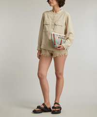 DETAILS Woven silk shorts Pilling throughout Relaxed fit Super-short length Drawstring waistband Side slip pockets Rear buttoned patch pockets Distressed hems SIZE & FIT Model is 175cm/5'9"; Chest: 80cm; Waist: 64cm; Hip: 95cm and wears a size 8 COMPOSITION & CARE 100% Silk Dry clean