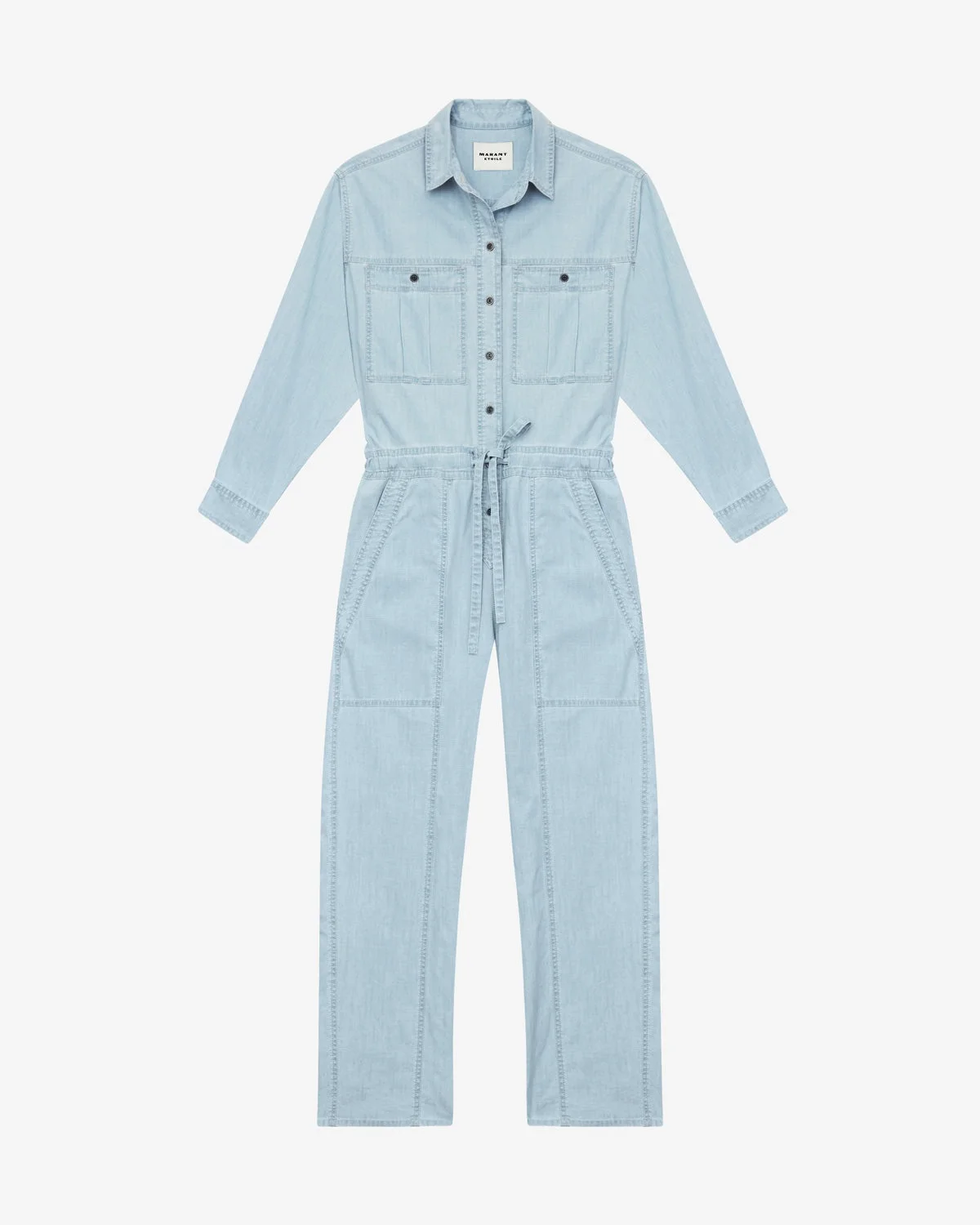Chambray jumpsuit Shirt collar Buttoned front Buttoned patch pockets on the chest Long sleeves Straight cuffs Waistband with drawstring Side pockets Relaxed fit Style: CB0074FAC1I01E30LU VALENA 100% cotton