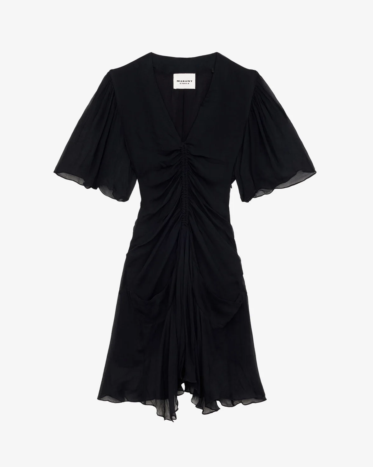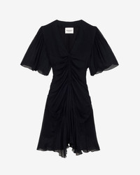 Plain-colored muslin dress Low-cut V-neckline Short sleeves with gathered ruffles Gathered front Side pockets Done up on the side with a hidden zipper Pointed flared skirt Plain-colored lining Cropped with a fitted waist Style: RO0330FAC1J07E01BK VIVIENNE 100% viscose