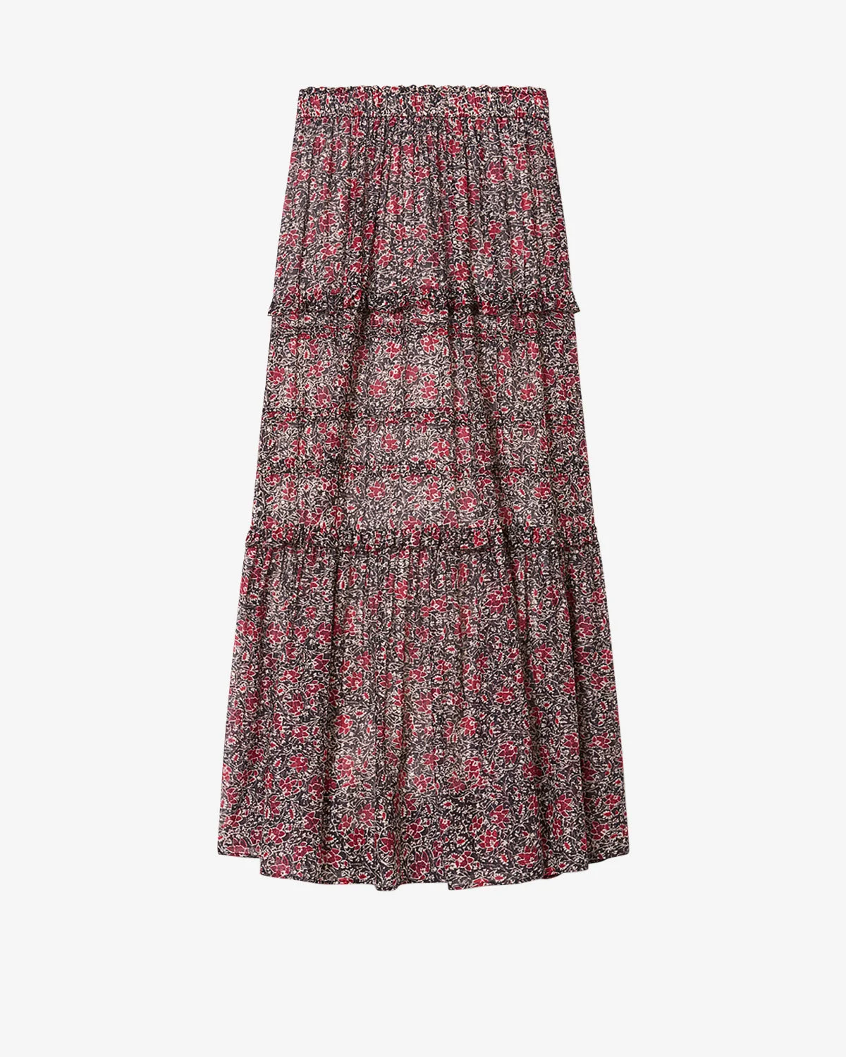 Organic cotton voile floral print skirt Elastic waist Frills and pintucks Flared cut Style: JU0488FAD1J14E86CY VOLOMIA 100% cotton (1) Care & Sustainability Machine wash on a gentle cycle, inside out and at a maximum temperature of 30°C For more details, see the instructions on the composition label the history and environmental impact of this product