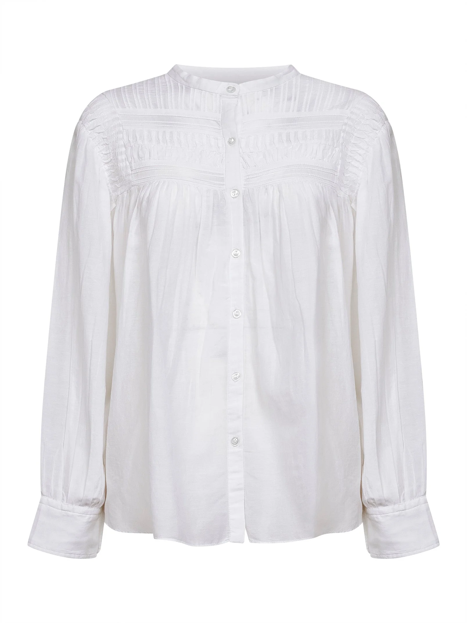 - Front button placket - Mandarin collar - Long sleeves with gathered detailing at shoulders and bottom, soft shoulders, two-button cuffs - Front and back pleat, gather and pintuck detailing at yoke - Gathered detailing at back - Rounded hem - Loose fit - White color - 80% cotton, 20% viscose - Made in extra eu Natural (Veg): Cotton80 % Synthetic: viscose20 % Made in: India Season: P26 HT0002FCB3J04E20WH