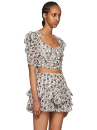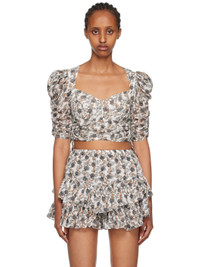 Plain-woven cotton blouse. Ruching and floral pattern printed throughout. · Sweetheart neck · Cropped hem · Puff sleeves · Zip closure at back · Fully lined Supplier color: Khaki 100% cotton. Made in India 231599F107001