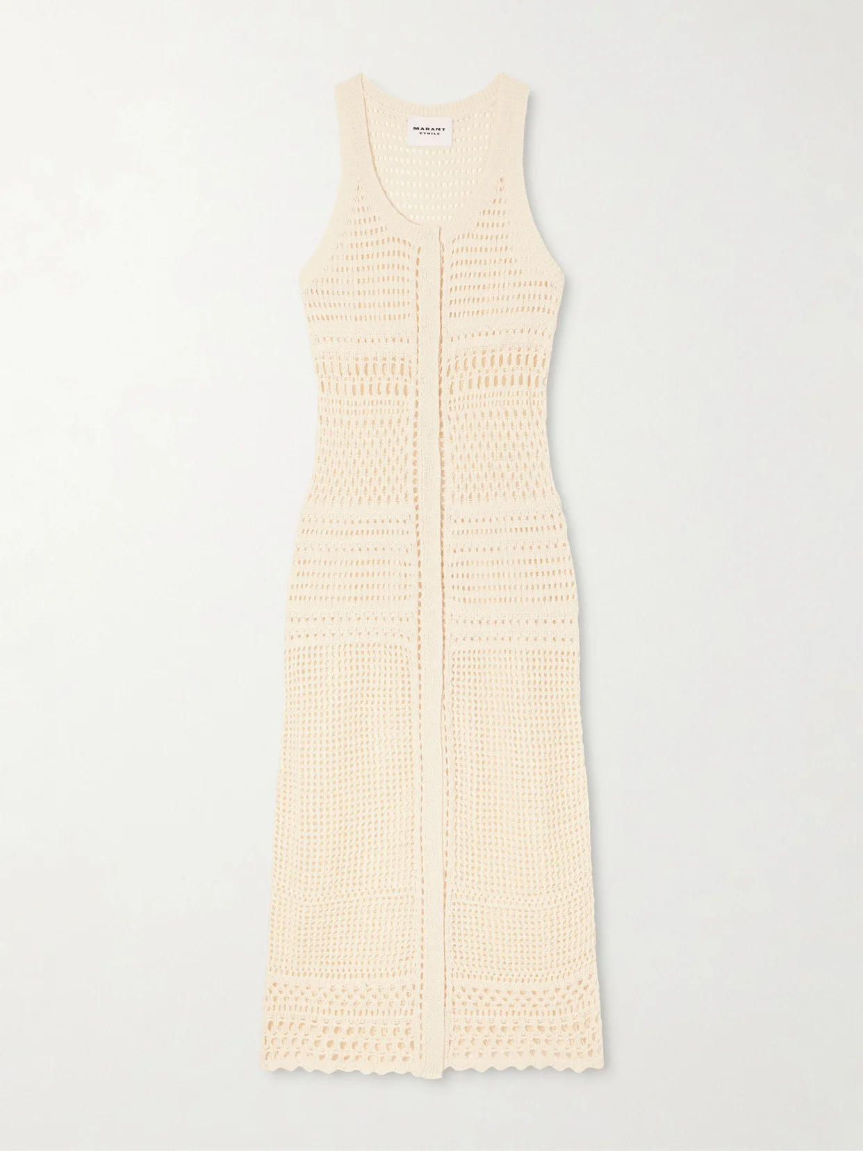 Marant Etoile's 'Zaro' dress works well for layering. Knitted from a cotton and linen-blend, it has an open-knit construction with ribbed trims and a scalloped hem. Style it over a bralette or with stacked jewelry.