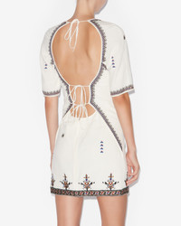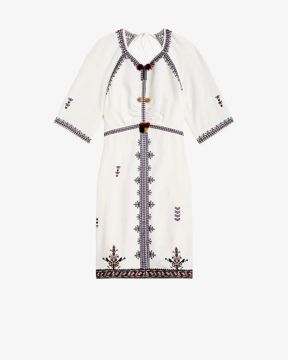 Gauze dress with graphic style embroidery Tunisian neckline Pompoms in front Short raglan sleeves Open back with tie strings Done up in back with a hidden zipper Graphic style embroidery Cotton lining Short and fitted cut Style: RO0686FAC1J09E23EC ZATINI 51% viscose, 41% cotton, 8% linen