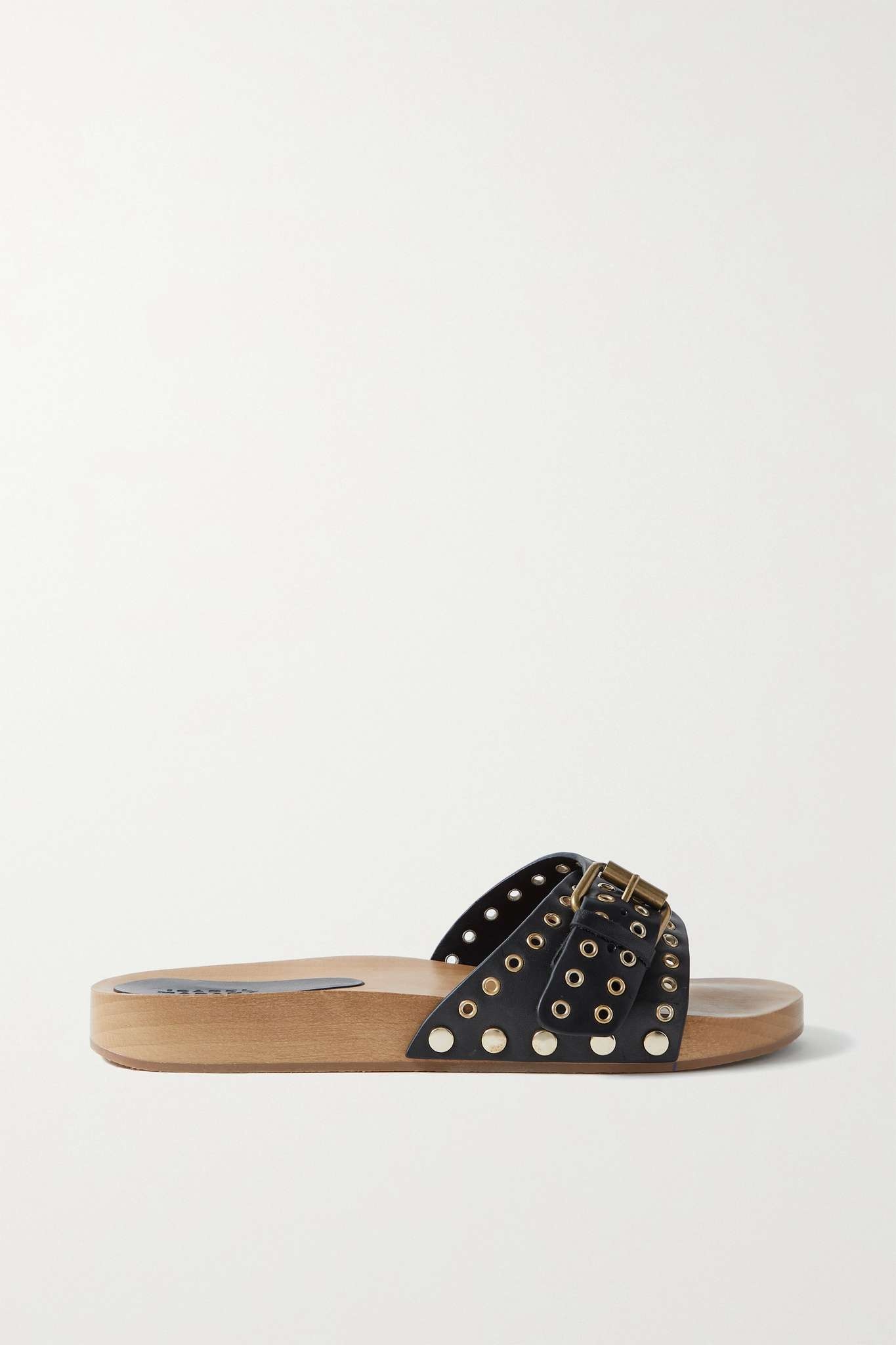 EDITORS'NOTES Isabel Marant's 'Jaso' slides are made from black leather punctuated with gold-tone eyelets and studs. They have adjustable buckle fastenings and are set on molded wooden soles. Wear yours with denim and dresses alike. SIZE & FIT - Fits true to size, take your normal size - French sizing DETAILS & CARE - Heel measures approximately 20mm/ 1 inch - Black leather - Slip on