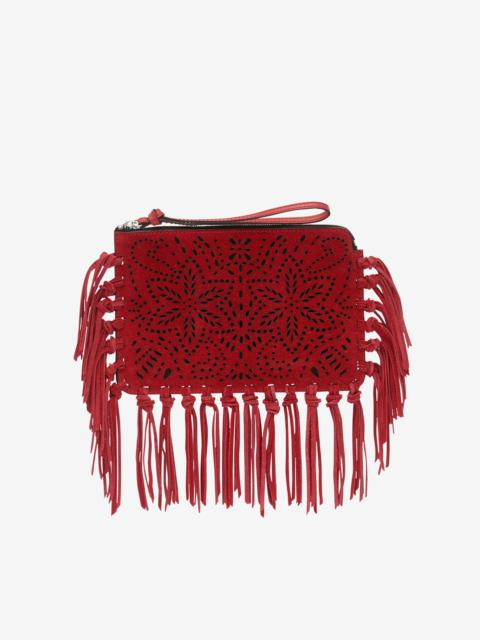 Clutch bag in perforated suede calfskin leather with fringes Done up with a gold-finish metal zipper Long leather slider Fringed finishes Twill lining Size: 21 x 14 cm / 8.3 x 5.5 in. Style: MP0062FC-B4C08M FLAT POUCH 100% suede calfskin leather