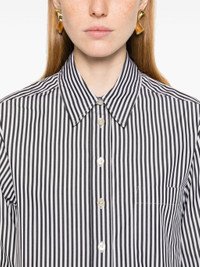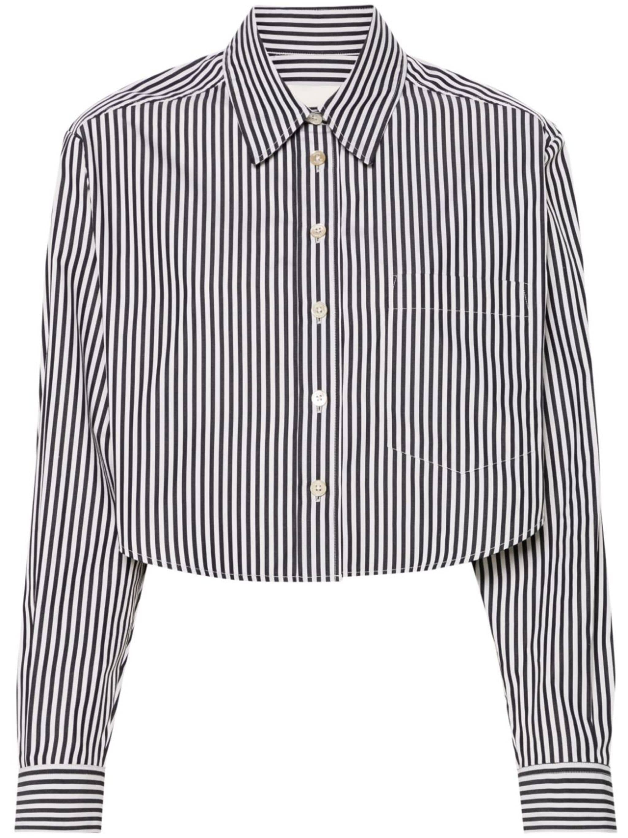black/ecru cotton poplin texture vertical stripe pattern pointed flat collar long sleeves buttoned-cuff sleeves chest patch pocket cropped curved hem front button fastening Size & Fit Model Measurements: Height: 1.77 m Bust/Chest: 88.0 cm Hips: 96.0 cm Waist: 66.0 cm Model wears size 36 Fabric and Care Designer Style ID: CH0179FAB1I01I Designer Colour: BKEC BLACK/ ECRU Composition: Cotton 100% Washing instructions: Machine Wash Made in Portugal