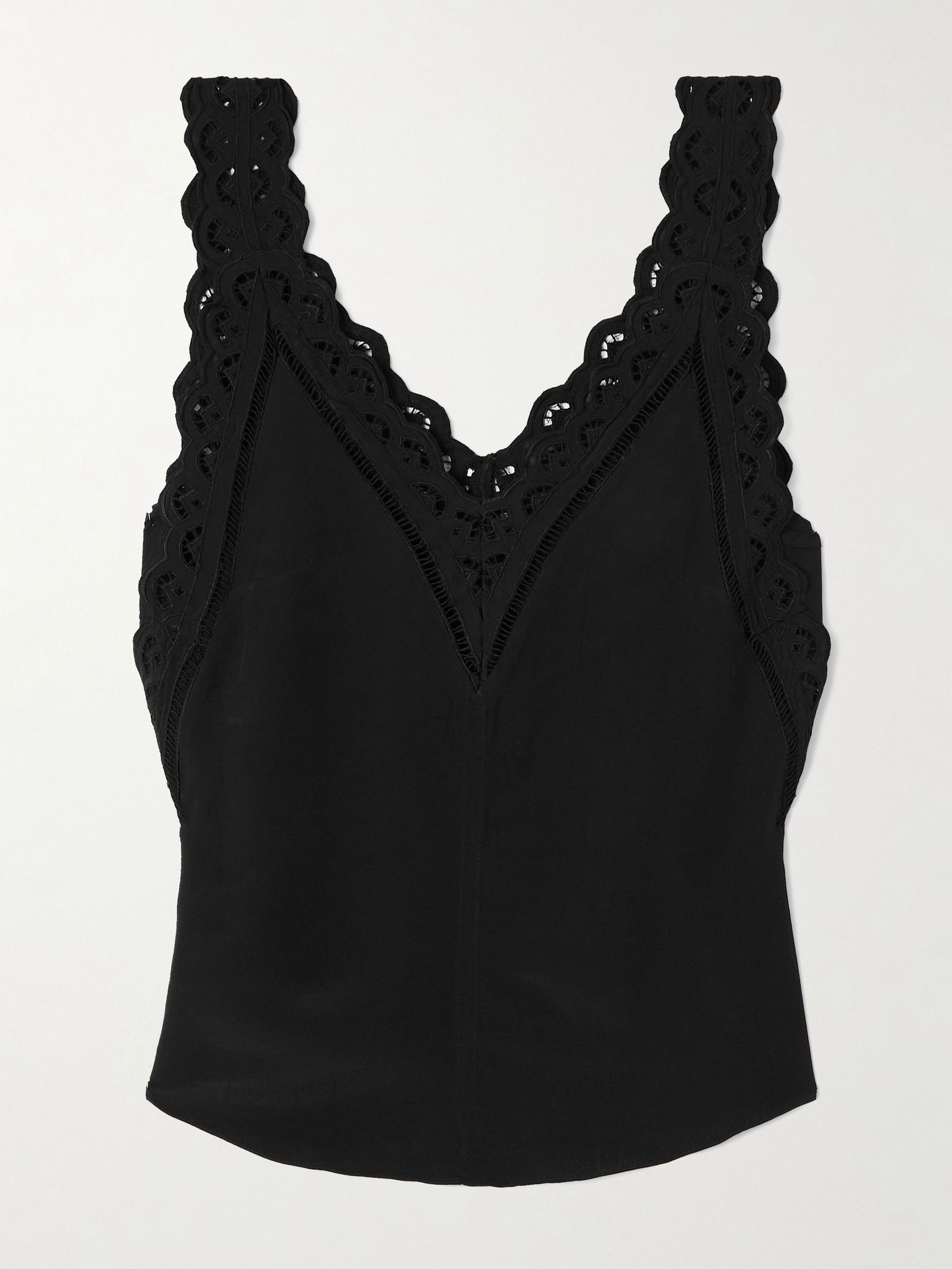 Isabel Marant's 'Fradela' tank is made from poplin and traced with guipure lace and ladder trims along the V-neckline. Tuck yours into high-waisted jeans or a skirt. Size & Fit - Fits true to size, take your normal size - Designed for a relaxed fit - Lightweight, non-stretchy fabric - Model is 177cm/ 5'10" and is wearing a FR 36 Model measurements: - Bust: 80cm/ 31.5" - Waist: 60cm/ 23.5" - Hip: 89cm/ 35" Details & Care - Black poplin and guipure lace - Slips on - 100% viscose; trim: 100% silk - Dry clean