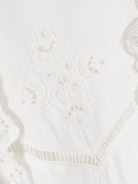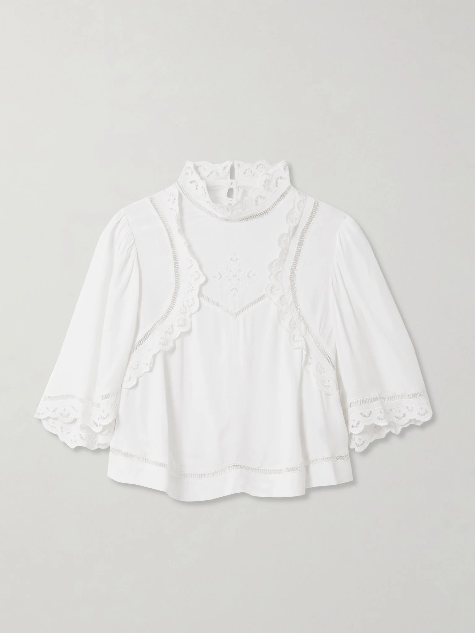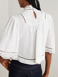 Isabel Marant's 'Frany' blouse features delicate ladder stitching and broderie anglaise that elevate its femininity and add airy breathability. It's made from crepe for a loose drape and has gently gathered shoulder seams and scalloped edges. Size & Fit - Fits true to size, take your normal size - Designed for a slightly loose fit - Mid-weight, non-stretchy fabric - Model is 180cm/ 5'11" and is wearing a FR 36 Model measurements: - Bust: 80cm/ 31.5" - Waist: 65cm/ 25.5" - Hip: 89cm/ 35" Details & Care - White broderie anglaise crepe - Button-fastening keyhole at back - 100% viscose - Dry clean