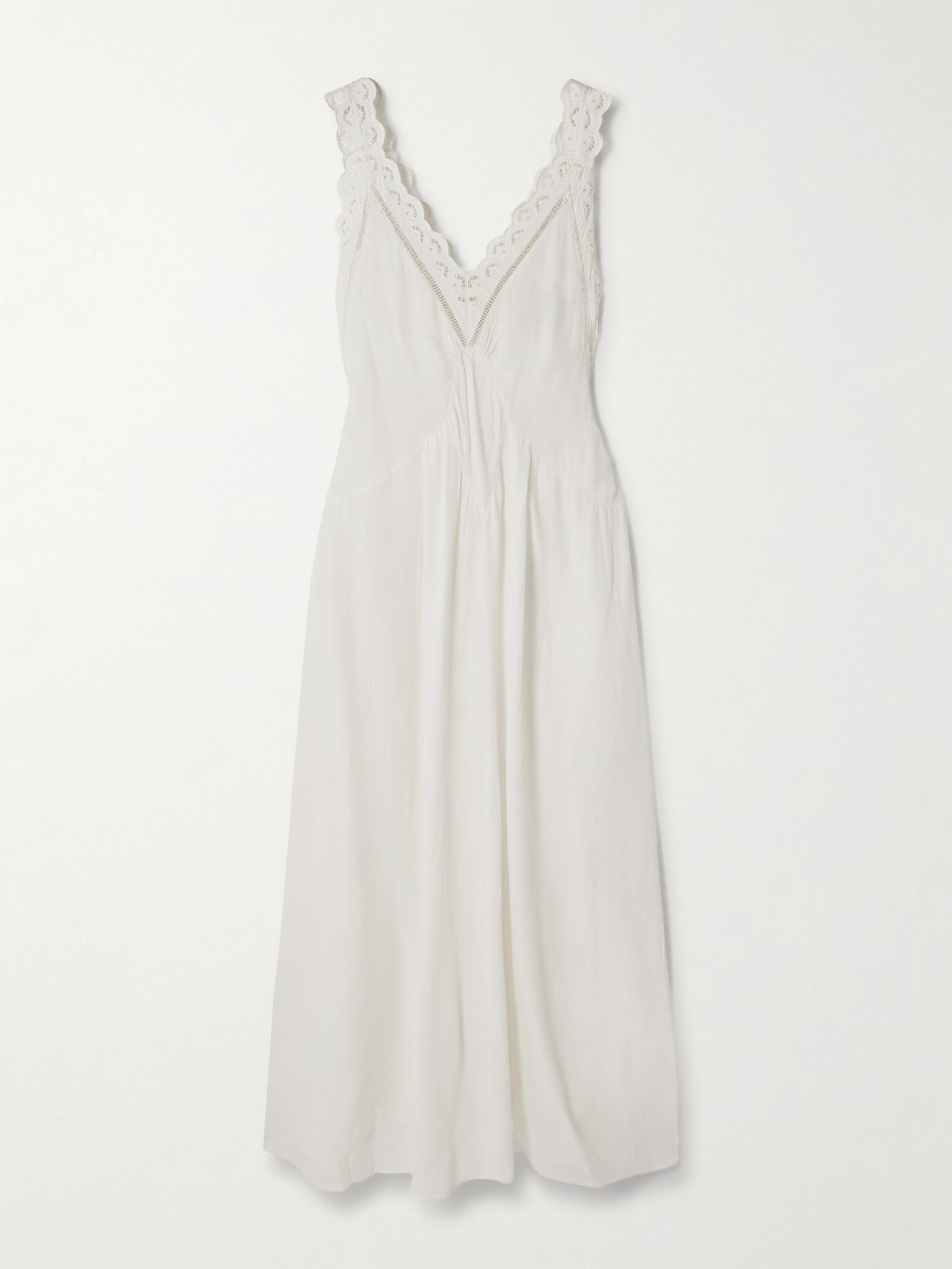 Isabel Marant's take on feminine dressing combines ease and elegance, making styles like this 'Freda' maxi dress effortlessly wearable. It's cut from smooth crepe that's gathered through the waist and traced with delicate broderie anglaise. Pull focus to the scalloped neckline with a dainty locket. Size & Fit - Fits true to size, take your normal size - Designed to be slightly fitted at the bust and waist, loose at the hip - Lightweight, non-stretchy fabric - Model is 177cm/ 5'10" and is wearing a FR 36 Model measurements: - Bust: 80cm/ 31.5" - Waist: 65cm/ 25.5" - Hip: 89cm/ 35" Details & Care - White crepe - Slips on - 100% viscose - Fully lined - Dry clean