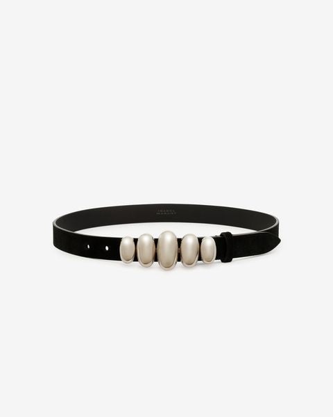 Calf velvet leather 55% Zamak 30% Brass 10% Cowhide 5% Thin belt in suede calfskin Bossette clasp Width: 2.4 cm