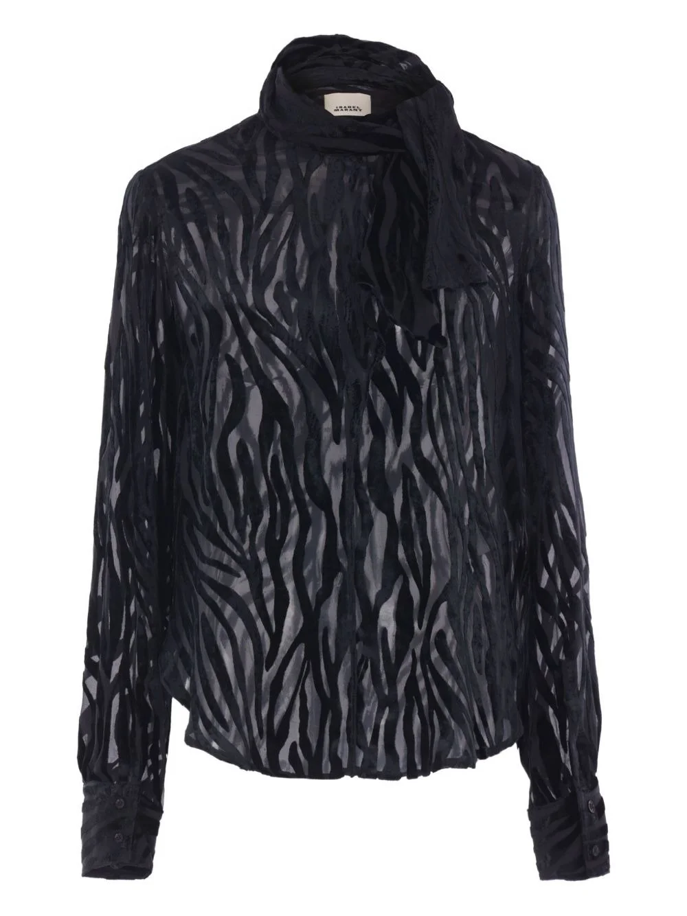 zebra-pattern tie-neck shirt Highlights - Black - Zebra pattern - Tie neck - Long sleeves - Front button fastening - Velvet Imported Composition Viscose 60%, Silk 40% Washing instructions Read Manufacturer Guidelines
