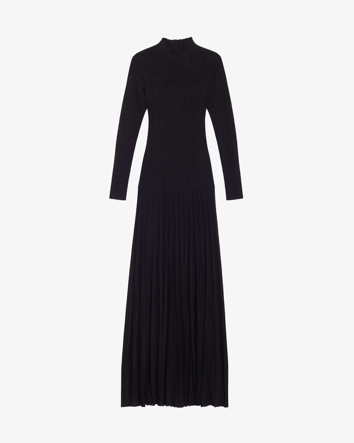 Plain-colored fine crepe knit dress Stand-up collar Long sleeves Openwork knit top Pleated mesh skirt Long fitted cut with a flared skirt Style: RO0741FAC1L01I01BK GISOLE 46% cotton, 42% viscose, 10% polyamide, 2% elastane