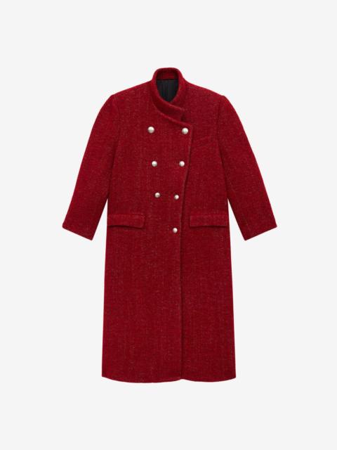 Long brushed wool blend coat Stand-up collar Long sleeves with buttoned cuffs with hammered metal buttons Raglan chest pocket Flap pockets on the sides Asymmetrical button tab Vent Straight oversized cut Style: MA0472FA-C4E01I GIUSA 34% cotton, 16% polyester, 14% alpaca, 14% mohair, 12% wool, 10% polyamide