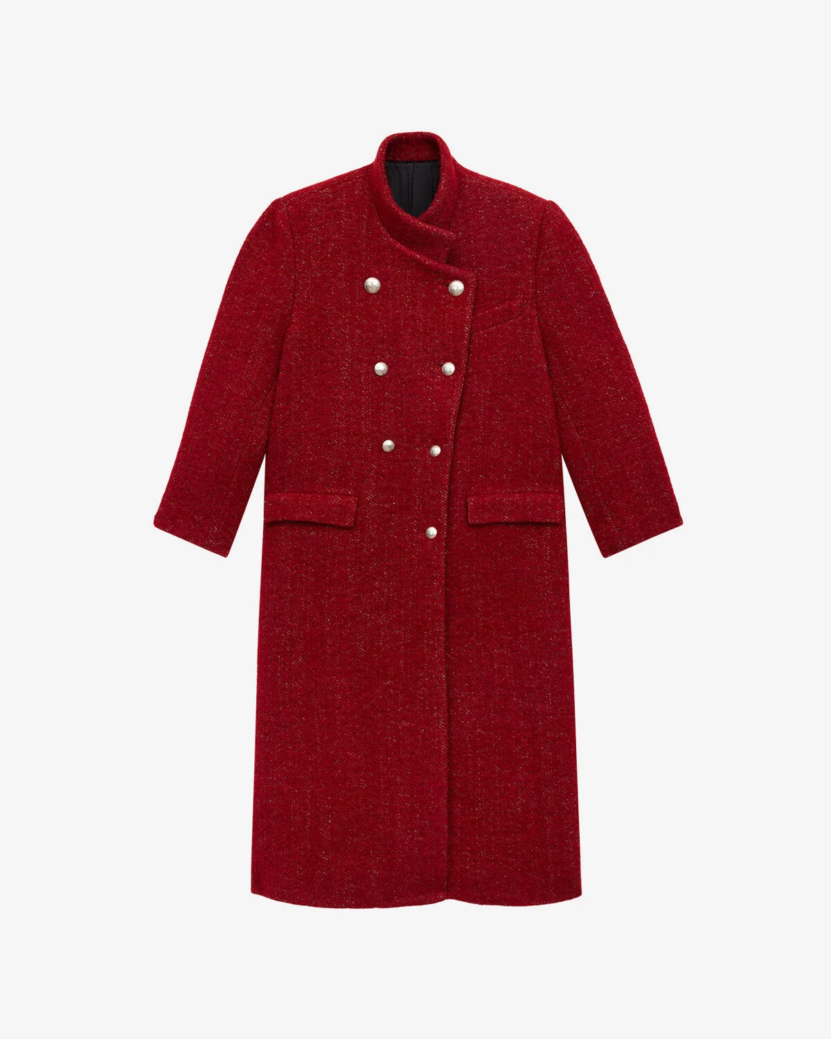 Long brushed wool blend coat Stand-up collar Long sleeves with buttoned cuffs with hammered metal buttons Raglan chest pocket Flap pockets on the sides Asymmetrical button tab Vent Straight oversized cut Style: MA0472FA-C4E01I GIUSA 34% cotton, 16% polyester, 14% alpaca, 14% mohair, 12% wool, 10% polyamide