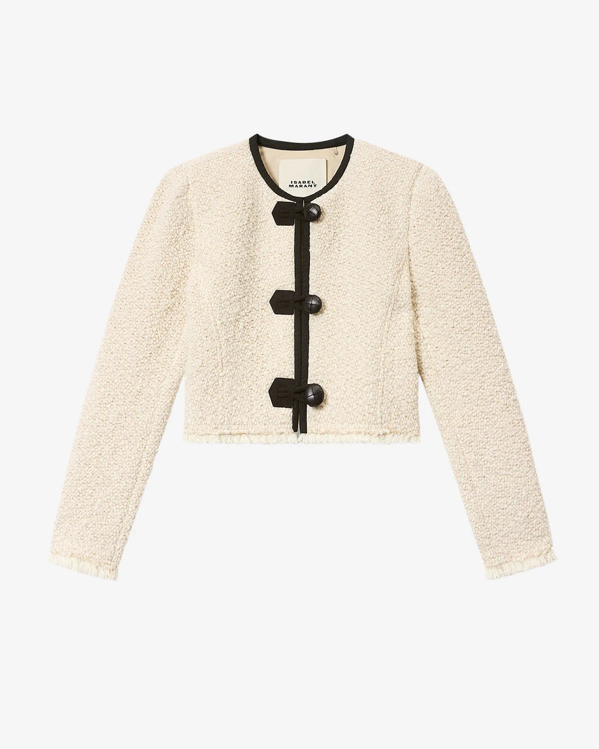Short boucle jacket with suede style details Round neck Structured padded shoulders Long sleeves Fringed finishes Faux suede toggle fastener and faux leather buttons Contrasting piping and buttons Short and fitted Style: VE0181FCD1E03I23EC GRADILIA 46% acrylic, 38% wool, 16% polyester Care & Sustainability Dry clean only For more details, see the instructions on the composition label the history and environmental impact of this product