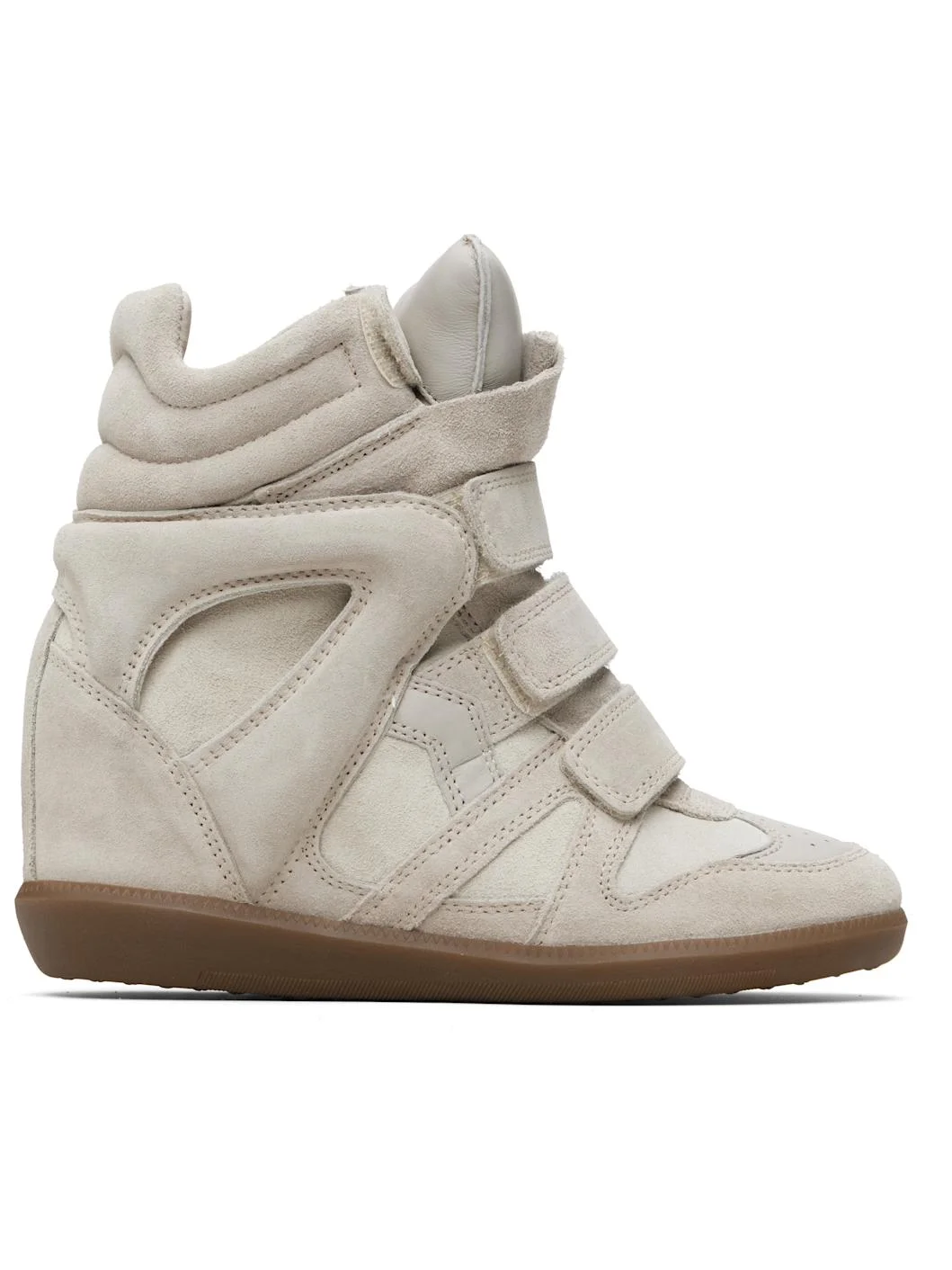 High-top suede sneakers. · Perforated detailing at toe · Velcro closure · Padded tongue · Quilted padded collar · Cutout and logo applique at sides · Grained pigskin lining · Concealed wedge heel · Treaded rubber sole · Heel: H3.25" Supplier color: Ecru Upper: leather. Sole: rubber. Made in Portugal 261600F127008
