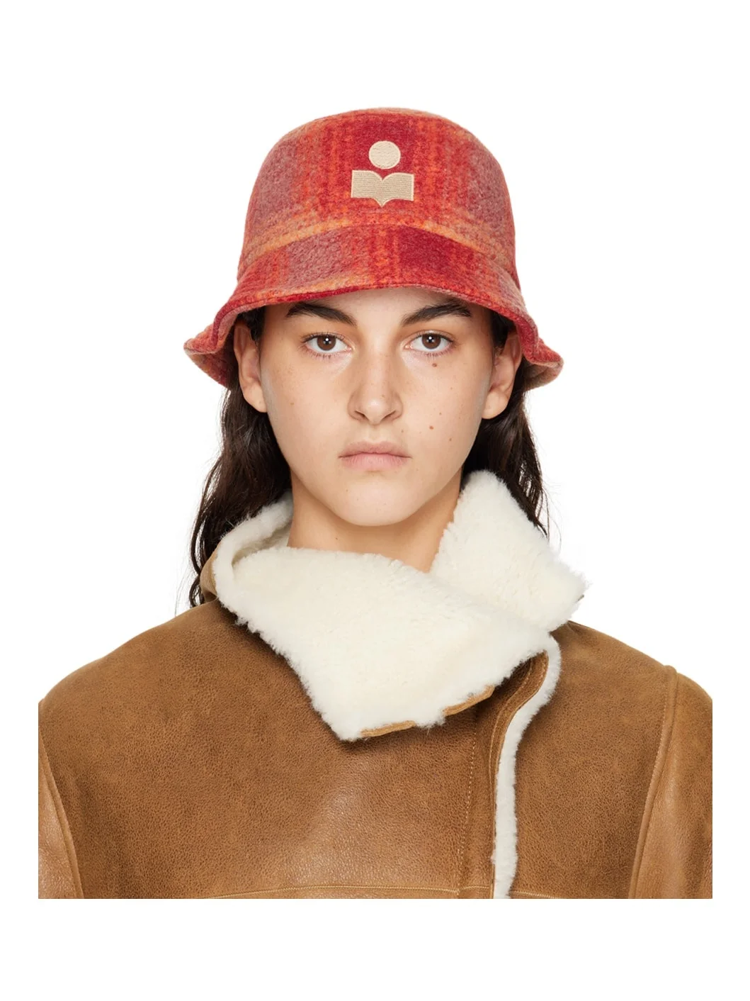 Felted virgin wool-blend bucket hat in red and orange. Check pattern throughout. · Logo embroidered at face · Quilted brim · Cotton poplin lining Supplier color: Orange Body: 18% polyester, 27% virgin wool, 18% polyester, 15% acrylic. Lining: 100% cotton. Made in Bulgaria 232600F015000