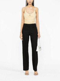 high-waisted tailored trousers Isabel Marant's affinity for laid-back elegance is captured in these black trousers. They're tailored to a wide-leg silhouette and characterised by their clean lines. Highlights - Black - Cotton - High waist - Concealed front fastening - Straight leg - Rear button-fastening jetted pocket - This item contains at least 50% materials which are certified or widely recognised as having a lower environmental impact through production and/or manufacturing processes that reduce water consumption and the use of harmful chemicals, or re-use by-products of the production process. - Learn more about what makes a product conscious on our conscious criteria page Imported Composition Outer: Hemp 58%, Viscose 39%, Elastane 3% Lining: Cotton 100% SIZE & FIT Model measurements Height 5 ft 10 in(1.77 m) Bust/Chest 32.7 in(83 cm) Hips 35.4 in(90 cm) Waist 23.6 in(60 cm) FittingInformation Designed for a straight-leg fit, these trousers allow for a close fit at the waist and an unrestricted, comfortable fit over the leg Made from a midweight stretch fabric, this piece offers elasticity and flexibility when worn This piece fits true to size – take your usual size