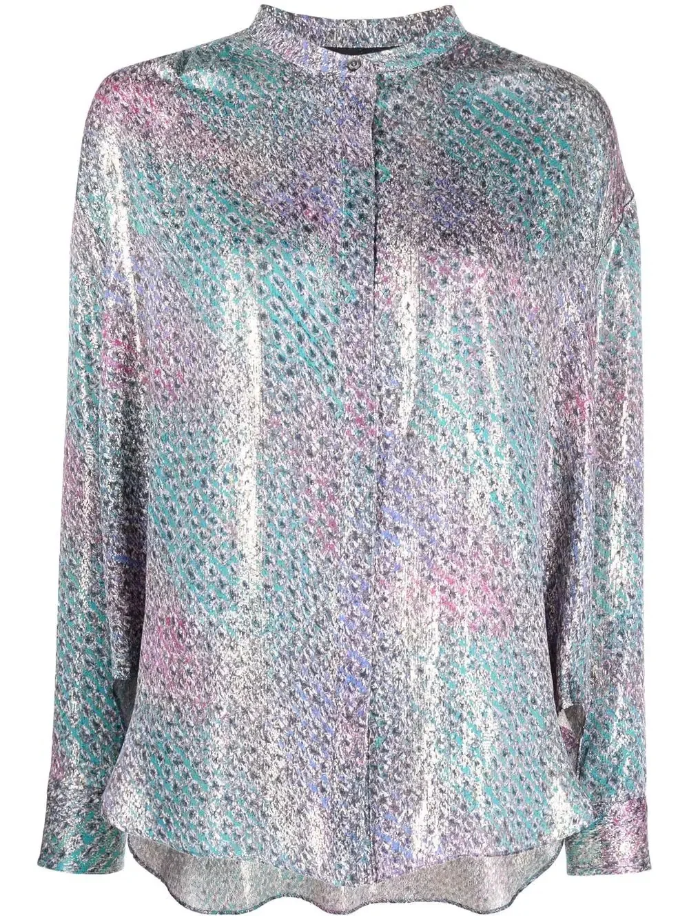 lurex shirt Iridescent fabrics are one of the main innovations brought by Isabel Marant's SS22 collection. That same effect is featured in this lurex shirt for a mermaid-inspired style, making the colours change according to the intensity of the lightning. Highlights - Blue/multicolour - Silk-blend - Iridescent effect - Abstract pattern print - Lurex detailing - Band collar - Concealed front fastening - Long sleeves - Buttoned cuffs - Asymmetric hem Imported Composition Outer: Silk 86%, Polyester 14% Lining: Viscose 100% SIZE & FIT Model measurements Height 5 ft 10 in(1.77 m) Bust/Chest 32.67 in(83 cm) Hips 35.43 in(90 cm) Waist 23.62 in(60 cm) FittingInformation This piece fits true to size. We recommend you get your regular size Cut for a loose fit Made with a mid-weight non-stretch fabric Washing instructions Dry Clean Only