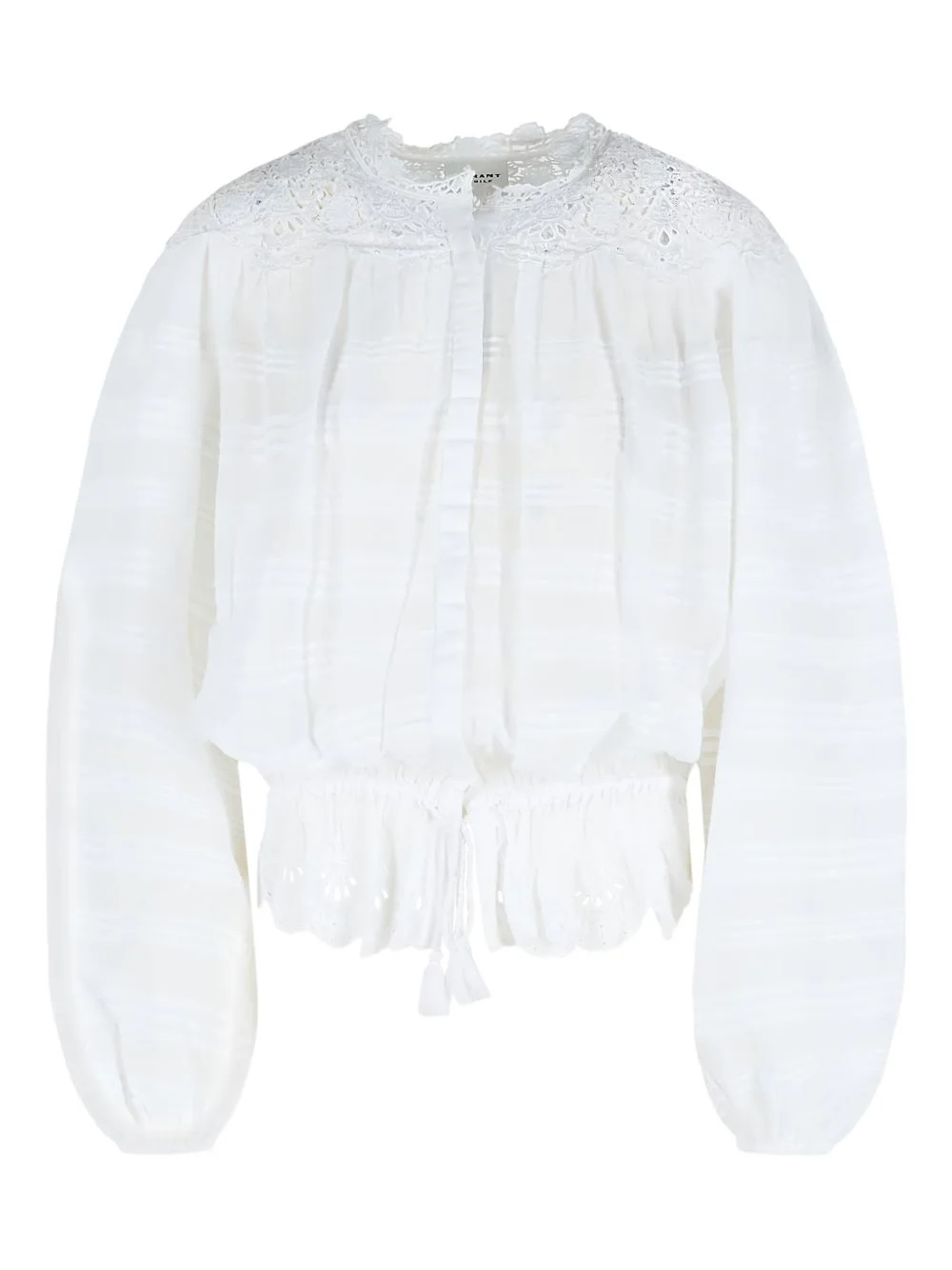 Polly lace pleated cotton top Highlights - White - Lace trim - Front button closure - Pleat details - Wide sleeves - Elastic cuffs - Elastic drawstring hem Imported Composition Cotton 100% Washing instructions Read Manufacturer Guidelines