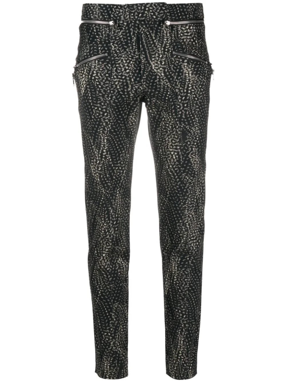 Izis slim-fit trousers Highlights - Black/grey/off-white - Stretch-cotton - Abstract pattern print - Zip details - Slim cut - Low-rise - Front press-stud and zip fastening - Front zip fastening pockets - Two rear welt pockets Imported Composition Outer: Cotton 97%, Elastane 3% Lining: Cotton 100% SIZE & FIT Model measurements Height 5 ft 10 in(1.77 m) Bust/Chest 31.1 in(79 cm) Hips 34.64 in(88 cm) Waist 24.8 in(63 cm) FittingInformation Designed for a slim fit, these trousers offer a close fit at the waist, allowing a comfortable close fit and some movement over the leg Made from a midweight stretch fabric, this piece offers elasticity and flexibility when worn This piece fits true to size – take your usual size Washing instructions Dry Clean Only