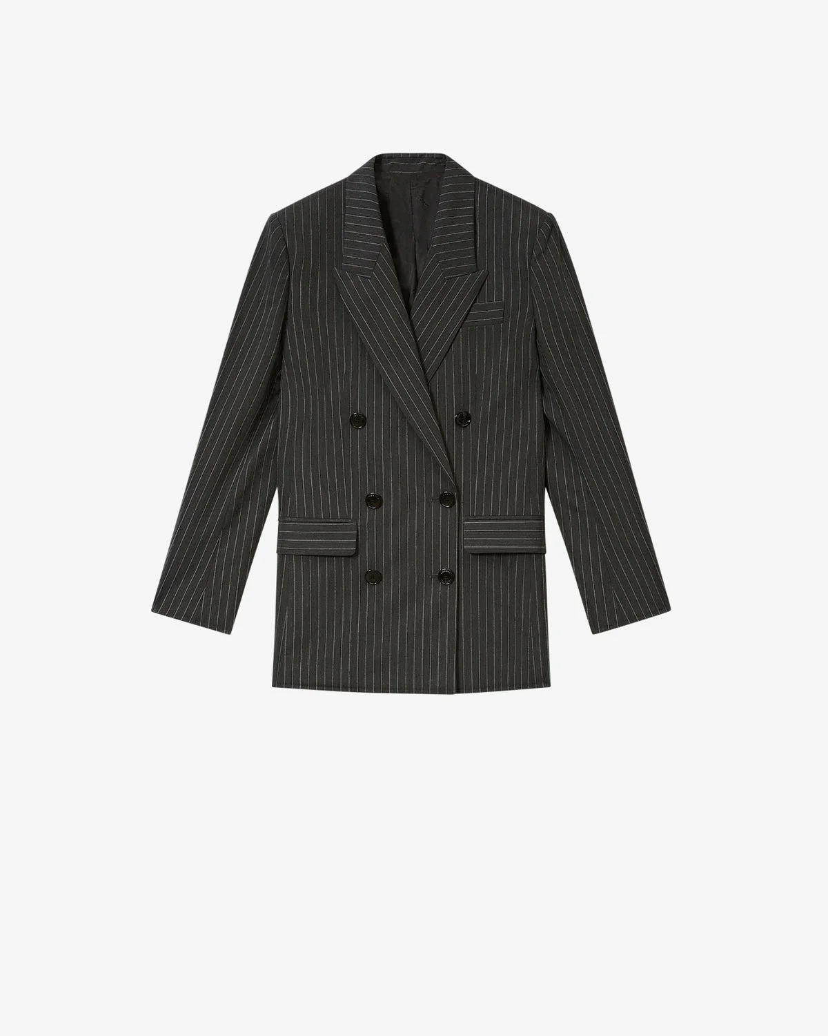 Striped wool blend suit jacket Italian style lapel Structured padded shoulders Long sleeves Straight buttoned cuffs Chest pocket Flap pockets Buttoned crossover front Satin lining Straight cut Style: VE0538FDD1F01I02AN JEVIMA 54% virgin wool, 30% viscose, 16% polyester Care & Sustainability Dry clean only For more details, see the instructions on the composition label the history and environmental impact of this product