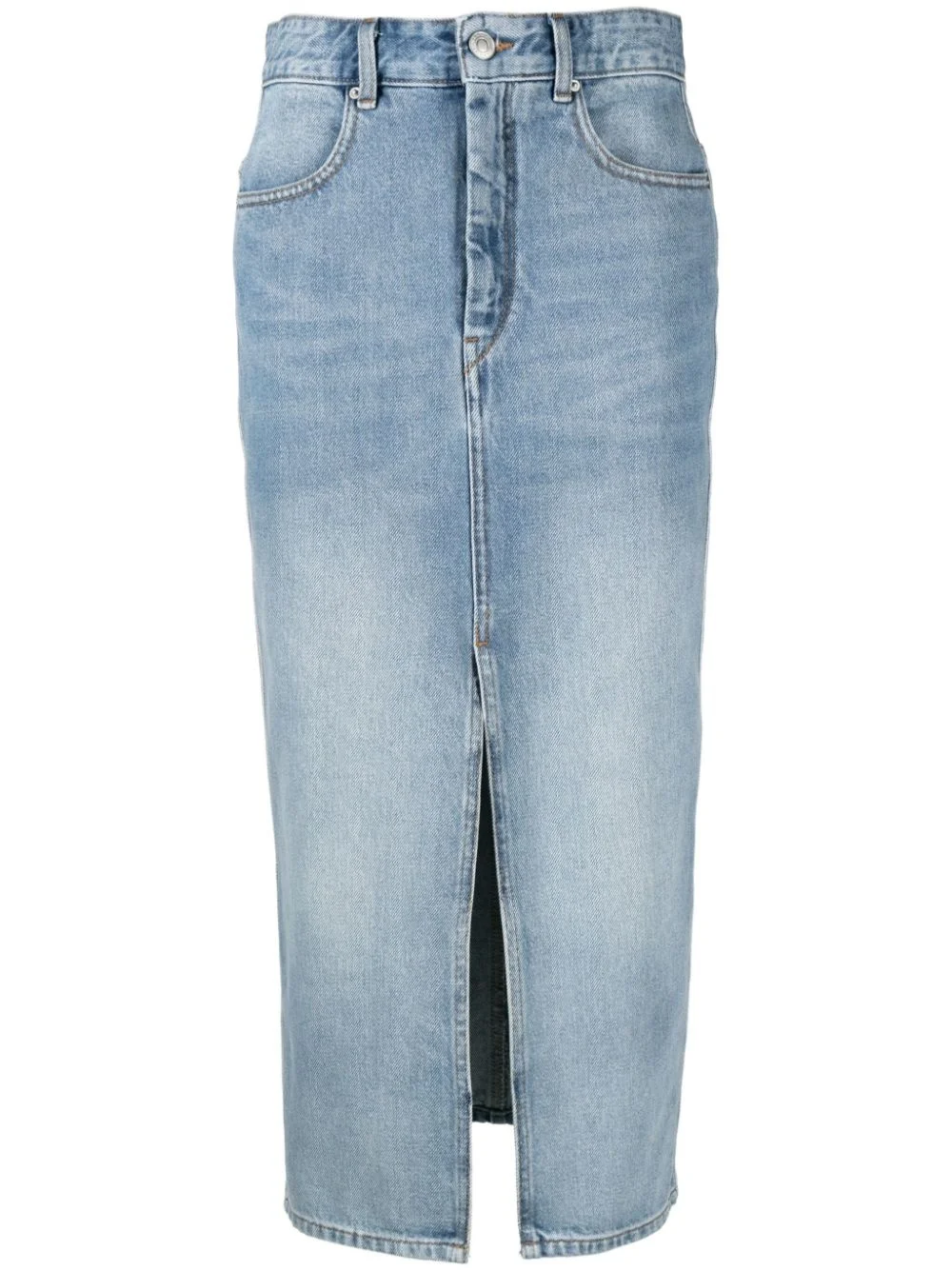 Julicia denim midi skirt Isabel Marant boasts a '90s inspiration with the Julicia denim skirt. The sleek faded design is made from a blend of cotton and hemp and defined by the front slit. Highlights - Ice blue - Cotton - Denim - Belt loops - Front button and zip fastening - Pencil silhouette - Classic five pockets - Front slit - Straight hem - Below-knee length Imported Composition Cotton 100% SIZE & FIT Model measurements Height 5 ft 11 in(1.8 m) Bust/Chest 30.7 in(78 cm) Hips 35.03 in(89 cm) Waist 24.4 in(62 cm) FittingInformation This midi-length skirt is intended to be worn just below the waist Sturdy and hard-wearing, this denim piece offers no stretch This piece fits true to size – take your usual size Measurement HIPS 35.98 in(91.4 cm) LENGTH 32.99 in(83.8 cm) WAIST 32 in(81.3 cm) Washing instructions Machine Wash
