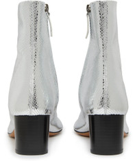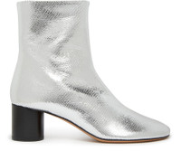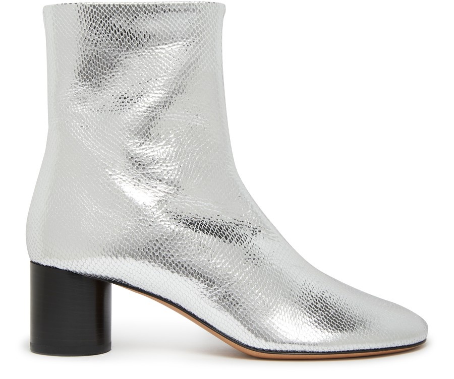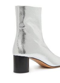 Isabel Marant's Laeden ankle boots feature a closed, round toe and zip details. The high-top upper and medium heel provide a stylish silhouette, with a side zipper for easy on and off. The block heel has a silver finish, adding a touch of edgy sophistication to this versatile footwear. DESCRIPTION - closed - round toe - zip details - high-top upper - medium heel - side zipper - block heel - silver finish DETAILS AND CARE MATERIAL: 100% Domestic goat capra hircus leather / 100% Sheep leather / Outer sole : 100% Cow leather HEEL HEIGHT: 6 cm / 2.4 " COLOR: silver COUNTRY OF MANUFACTURE: Italy PRODUCT CODE: IMAG8Q59SILU6A1A00