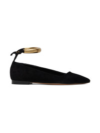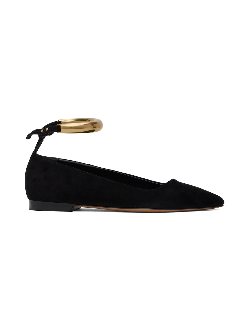 Goatskin suede ballerina flats in black. · Pointed toe · Graphic hardware at post-stud ankle strap · Gold-tone logo stamp at padded footbed · Buffed sheepskin lining · Polished leather sole Supplier color: Black/Gold Upper: goatskin, sheepskin. Sole: leather. Made in Italy 242600F118000