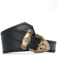 Black cow leather belt with an oversized engraved buckle in an antiqued gold tone. product code: CE044320A006ABKBS COMPOSITION 100% leather MADE IN ITALY