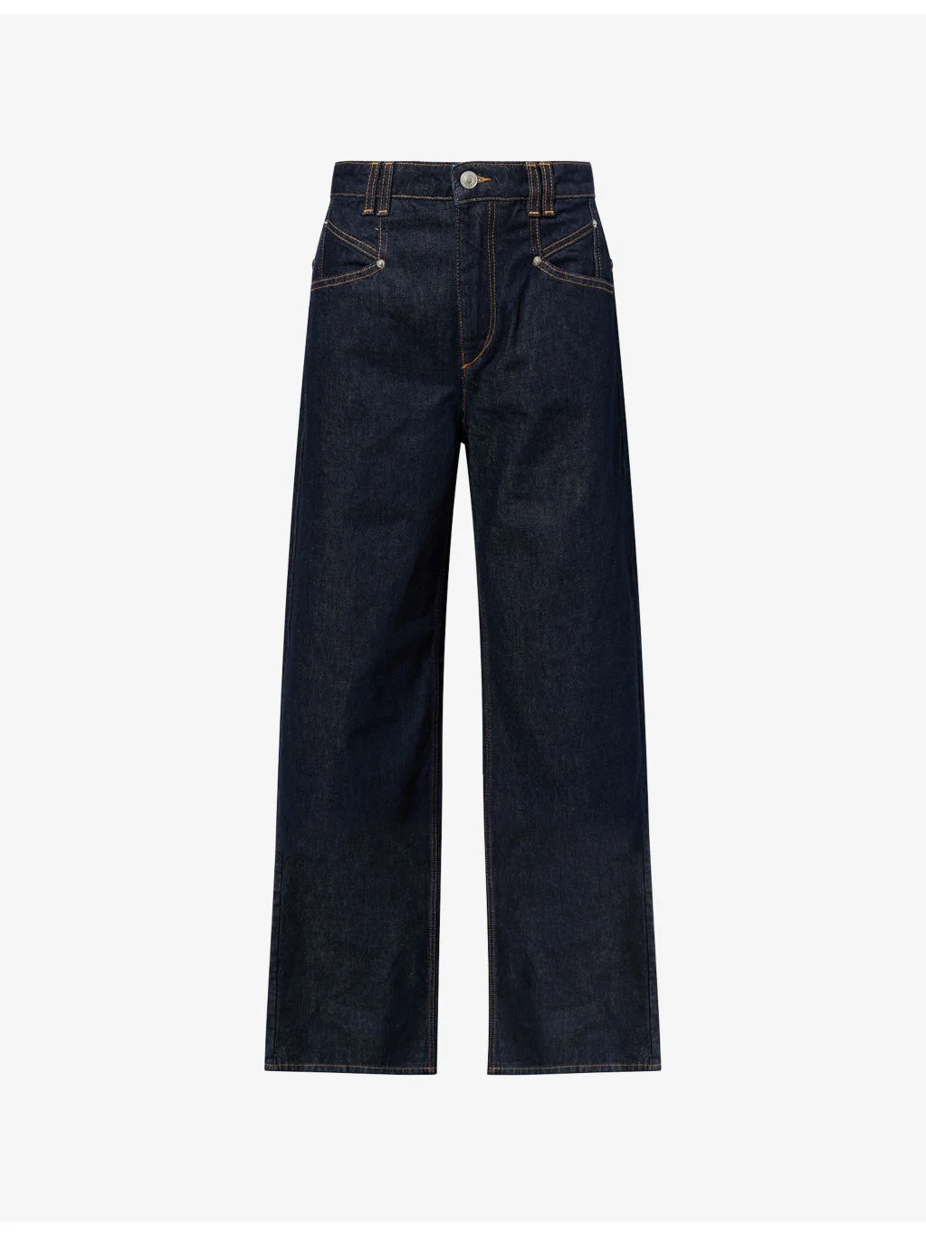 PRODUCT DETAILS - Isabel Marant denim jeans - 100% cotton - Button and zip-fly fastening - Relaxed fit, high-rise, wide leg, belt loops, four pockets, contrast stitching, branded patch at back, branded hardware - Machine wash cold - Made in Tunisia - True to size - Size UK 10: rise 13in / 33cm, inside leg 33in / 84cm, leg opening 25in / 63.5cm - Model is 5ft 10in / 1.78m and wears a size UK 10 - Midweight, non-stretch Ref: R04519904