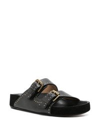 black calf leather smooth grain suede panelling gold-tone stud embellishment round open toe logo-engraved double buckle fastening branded footbed flat leather sole This piece comes complete with a protective dust bag. - heel: 2.5 centimetres, sole height: 2.0 centimetres - Color: BLACK - Made in: Portugal - Designer Style ID: B1B11S SD0118FA 01BK Composition and care Outer Composition Calf Leather: 100.0%, Lining Composition Calf Leather: 100.0%, Sole Composition Calf Leather: 100.0%