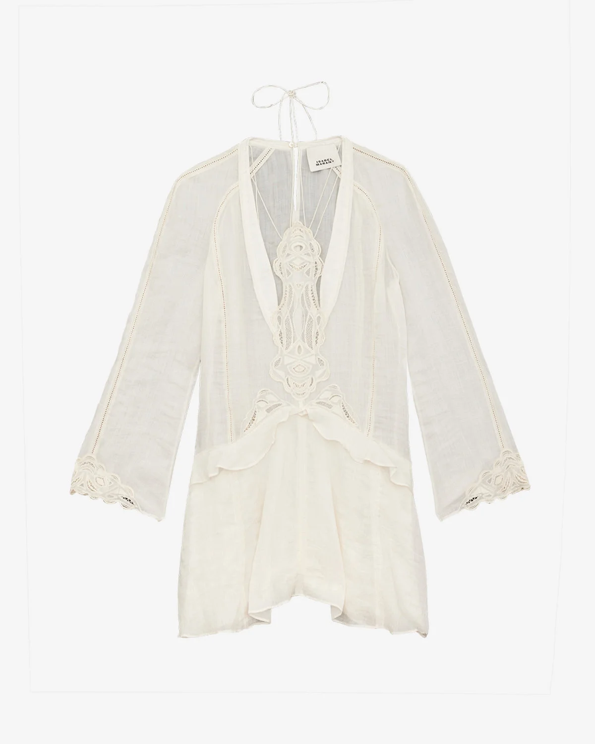 Embroidered ramie dress Low-cut V-neckline Embroidered neckline yoke Neck ties Done up at the neck with a buttoned slit Long flared raglan sleeves Embroidered cuffs Frills on the hips Straight cut Style: RO0776FAC2J08I23EC LIYA 100% ramie Care & Sustainability Cold hand wash with suitable detergent For more details, see the instructions on the composition label the history and environmental impact of this product