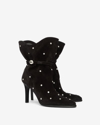 Draped studded suede leather ankle boots Flexible "gaiter" style uppers held in place by a string Pointed toes Leather straps, loops, and round metal jewel Stiletto heels covered in leather Soft leather insoles and outsoles Soft leather lining Heel height: 9 cm / 3.5 in. Style: BO0227FA-C4A22S LOLYA 100% suede calfskin leather