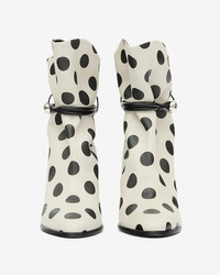 Draped polka dot leather ankle boots Flexible "gaiter" style uppers held in place by a string Pointed toes Leather straps, loops, and round metal jewel Stiletto heels covered in leather Soft leather insoles and outsoles Soft leather lining Heel height: 9 cm / 3.5 in. Style: BO0227FA-C4A19S LOLYA 100% lambskin