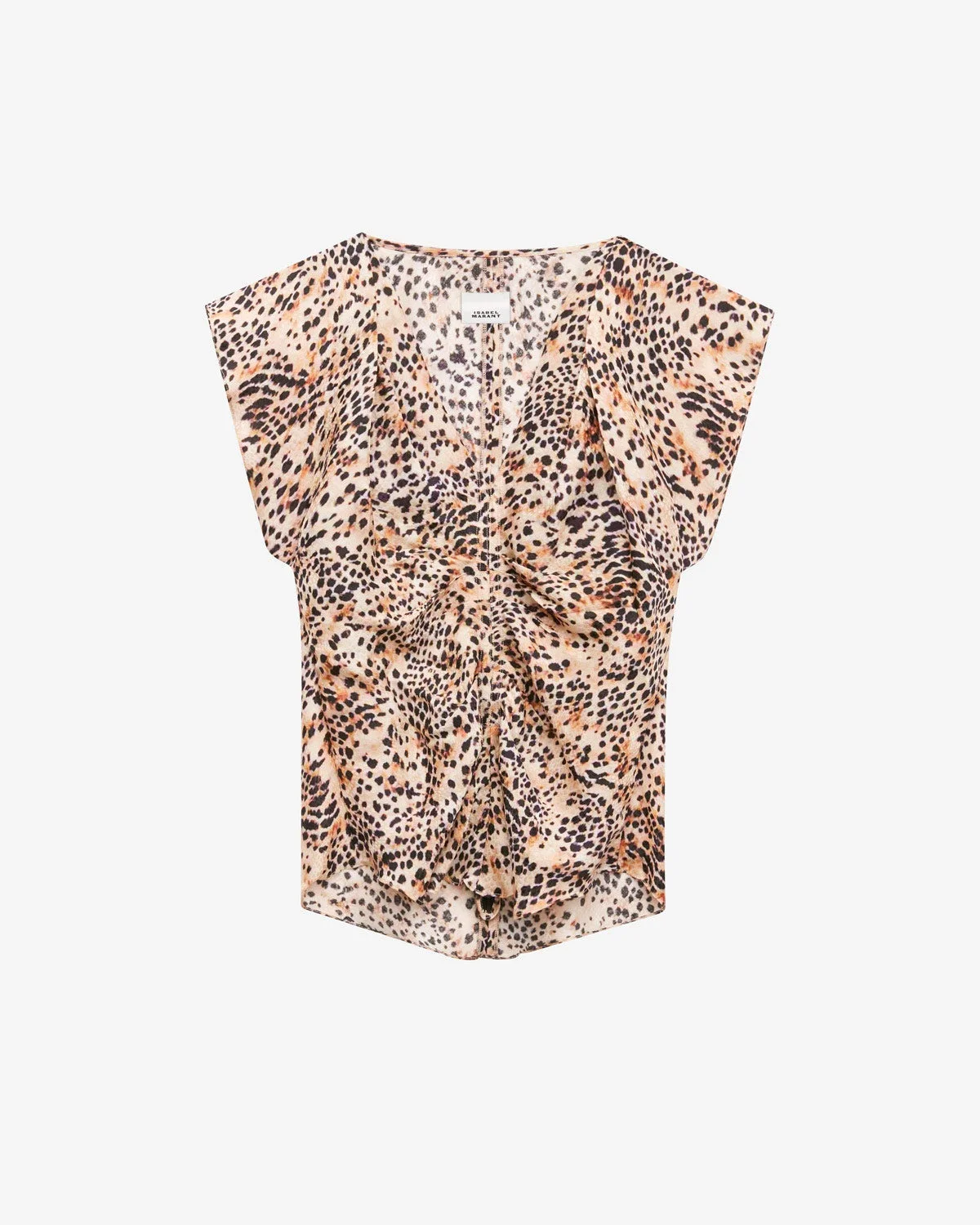 Printed flowing top Low-cut V-neckline Pleated front Short butterfly sleeves Relaxed fit Style: HT0228FA-B3J05I LONEA 65% viscose, 35% silk