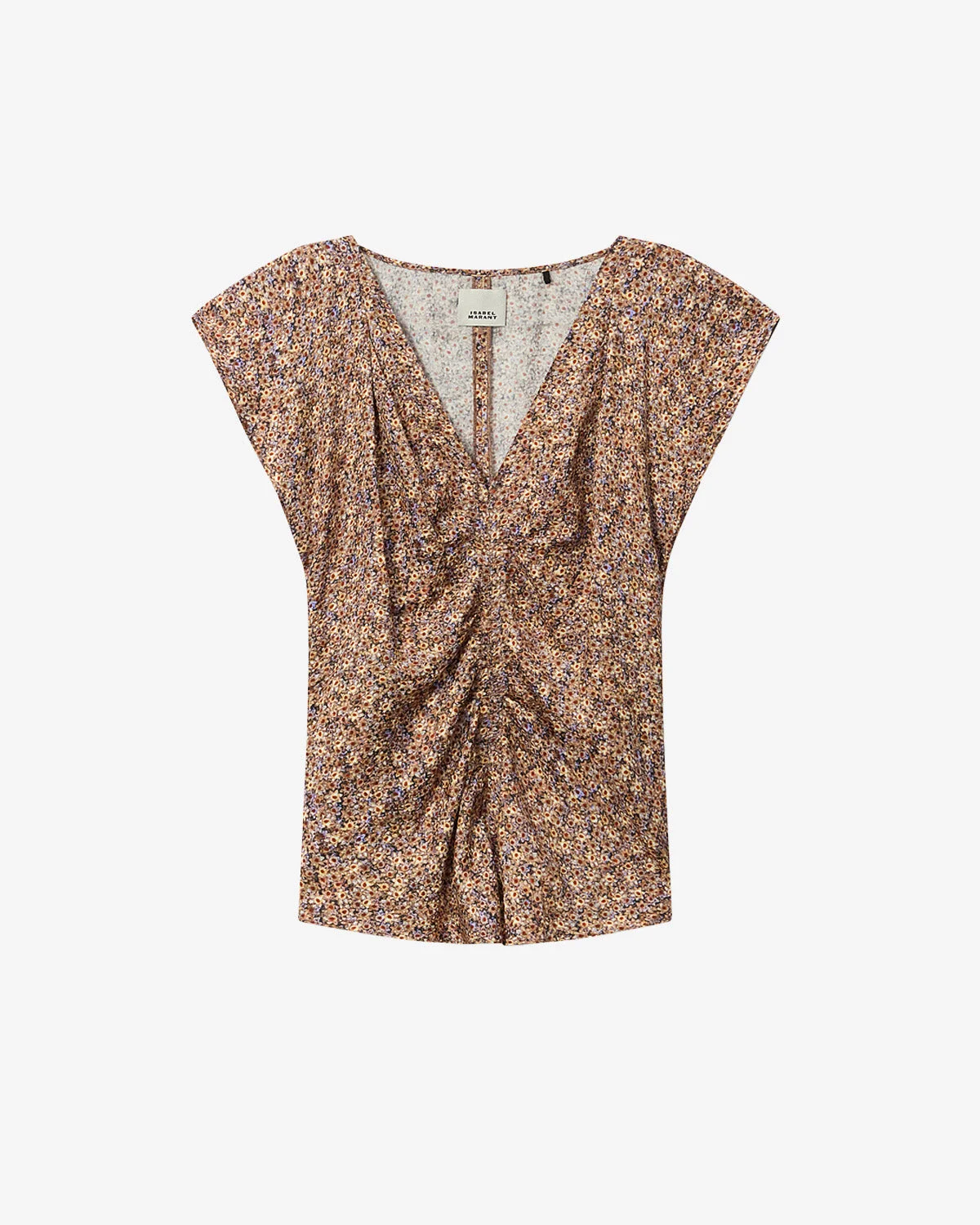 Draped daisy silk jacquard top V-neckline extended with gathers Short sleeves with wide shoulders Fitted Style: HT0228FDD1J13I10OE LONEA 65% viscose, 35% silk Care & Sustainability Dry clean only For more details, see the instructions on the composition label