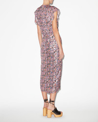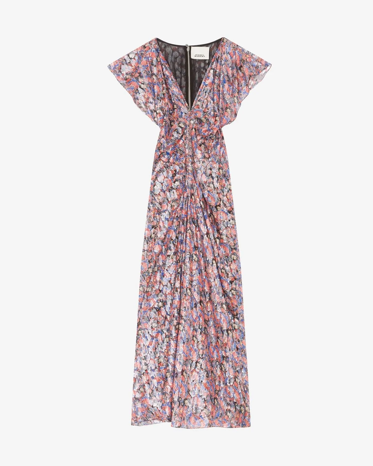 80% viscose, 20% polyester Long, pleated, printed short-sleeve dress V-neck Iridescent effect Frilly shoulder cut-outs Done up with a zipper Unlined Style: RO0229FB-B2J05I LYNDSAY