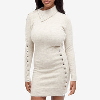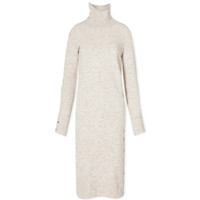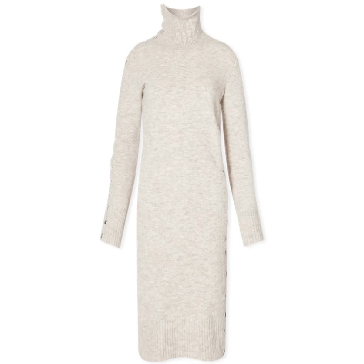 The Marina dress, making its debut as the first look on the Isabel Marant runway, is crafted to accentuate the body's contours. Made from a plush wool-alpaca blend, it feels as luxurious as it appears. Silver-tone snap buttons adorn the sleeve and hem, creating a bold slit at the leg when unbuttoned. - 43% Polyamide, 24% Acrylic, 23% Alpaca, 9% Wool, 1% Elastane - Ribbed Roll Neck - Snap Button Details - Ribbed Cuffs