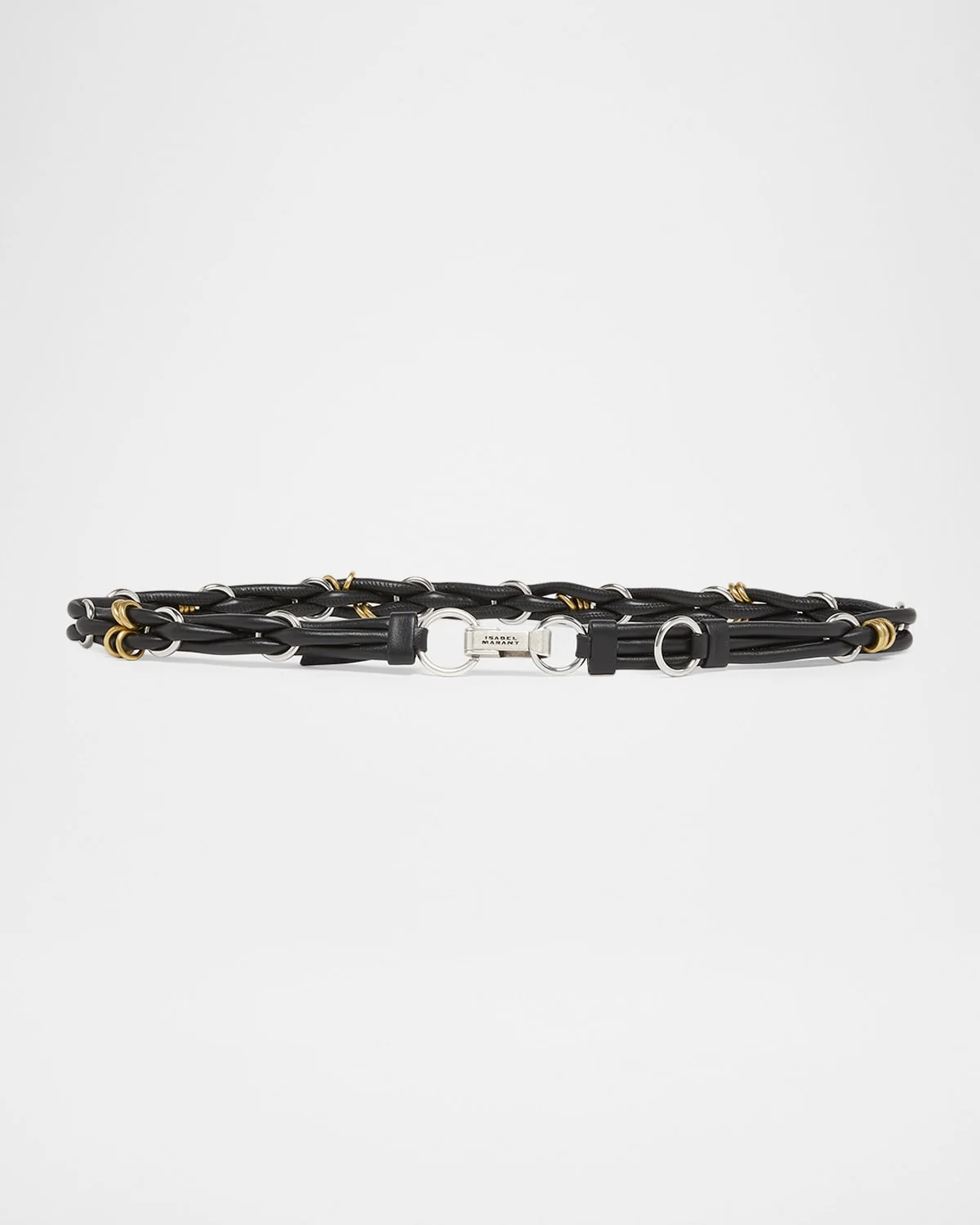 The "Mina" leather belt by Isabel Marant features a braided design embellished with goldtone and silvertone metal rings. Approx. 0.8" wide Adjustable clasp with snap hook Professional cleaning recommended Made in Italy