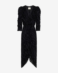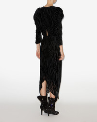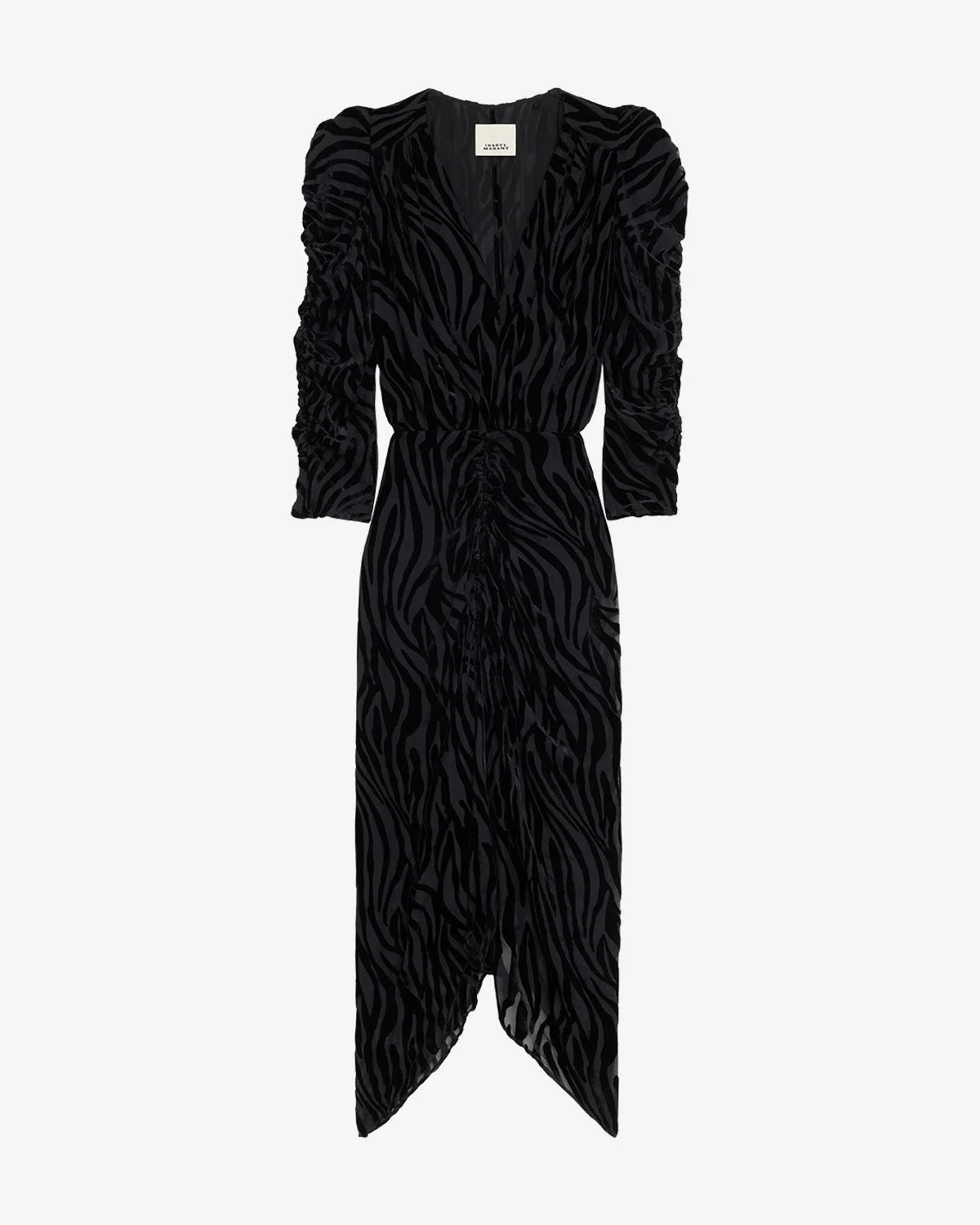 Long burnout velvet zebra pattern dress Crossover low-cut V-neckline Structured shoulders Long gathered sleeves Gathered hem and asymmetrical length Flowing cut Done up in back with a hook and a hidden zipper Style: RO0486FD-C4J24I NEMIL 64% viscose, 36% silk