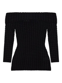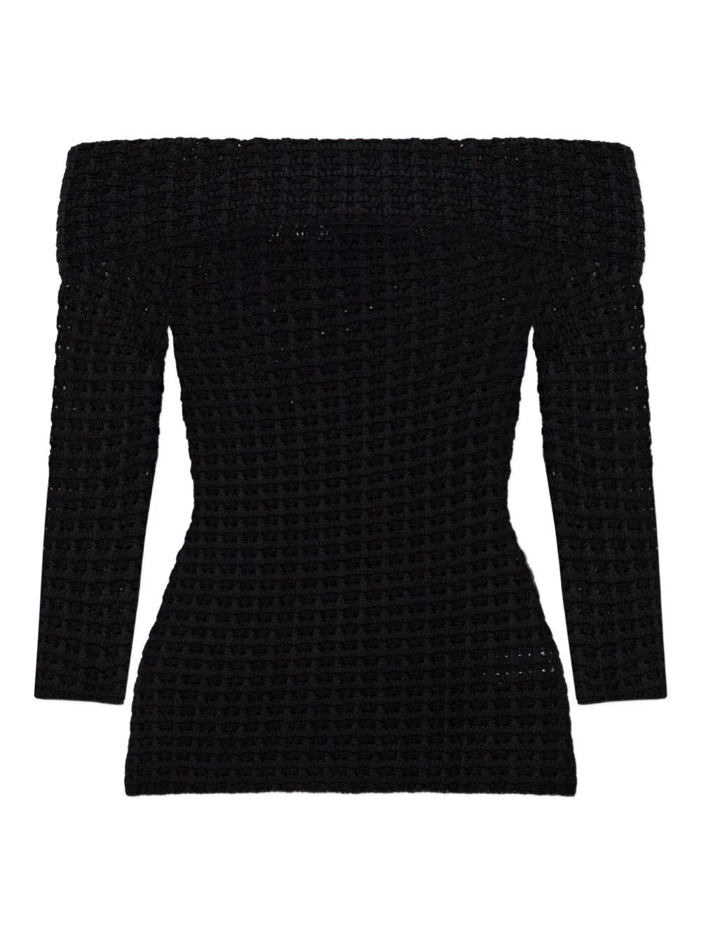 off-shoulder knitted top Highlights - Black - Off-shoulder neckline - Three-quarter sleeves - Open knit Imported Composition Viscose 100% Washing instructions Read Manufacturer Guidelines