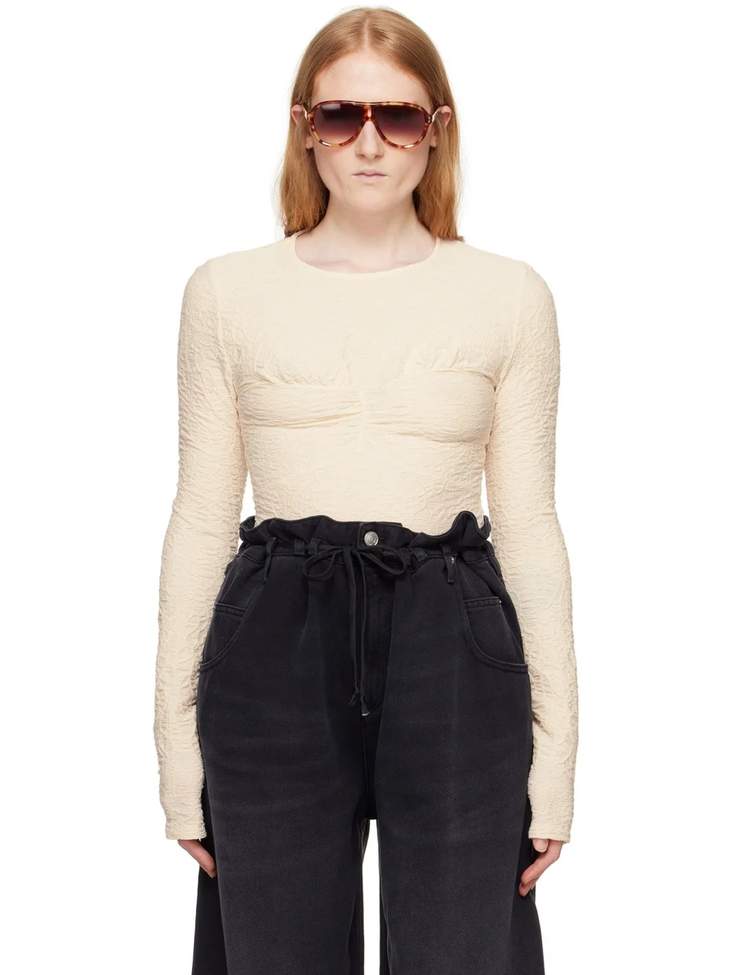 Stretch cotton-blend cloque T-shirt. · Round neck · Gathering at front · Concealed zip closure at back Supplier color: Ecru 56% cotton, 41% polyamide, 3% elastane. Made in Poland 241600F110002