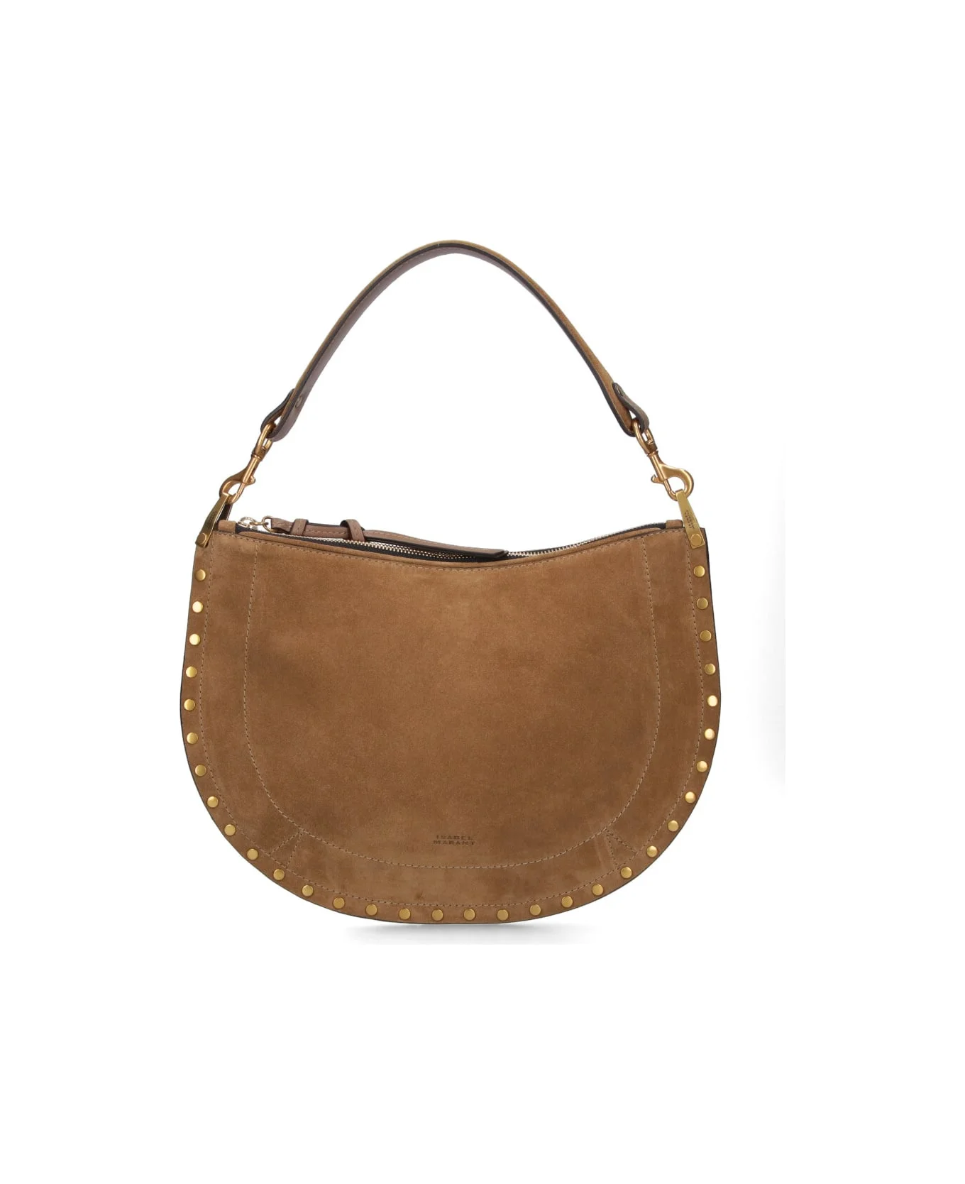 Isabel Marant Oksan Soft shoulder bag in brown suede with all-over gold metal studs, adjustable and removable shoulder strap, zip closure, knotted leather maxi zipper detail, gold logo print on the front, inner flat pocket, main inner compartment. Composition: 100% Calf Leather Made in: Tunisia Color: BROWN Size and fit: - A 22.5 X L 32.5 cm Model number: B2C03MBF0066FA
