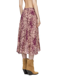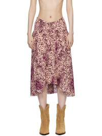 Stretch silk chiffon midi skirt. Graphic pattern printed throughout. · Ruching at waistband · Asymmetric hem · Zip closure at side seam · Unlined Supplier color: Purple/Ecru